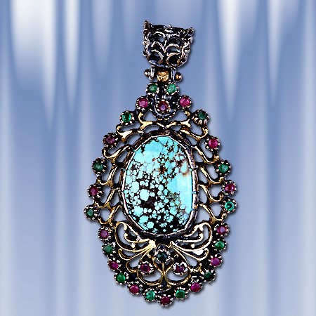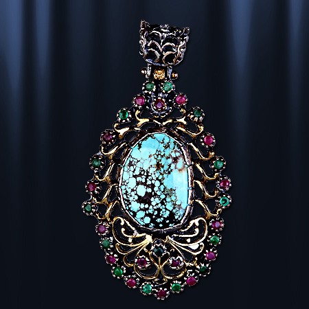 бирюзы (22 х 16 мм), которую красиво обрамляют 16 рубинов (диаметр 2 мм) и 16 изумрудов (диаметр 2 мм). Серебро чернёное 925 пробы,