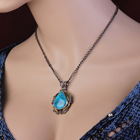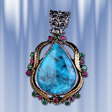 бирюзы (28 х 22 мм), которую красиво обрамляют 9 рубинов (диаметр 2 мм) и 9 изумрудов (диаметр 2 мм). Серебро чернёное 925 пробы,