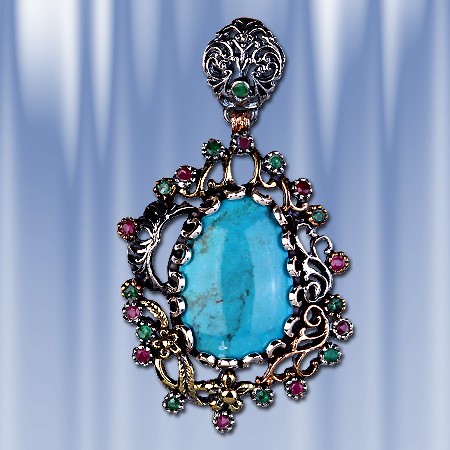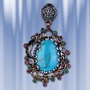бирюзы (24 х 18 мм), которую красиво обрамляют 10 рубинов (диаметр 2 мм) и 11 изумрудов (диаметр 2 мм). Серебро чернёное 925 пробы,