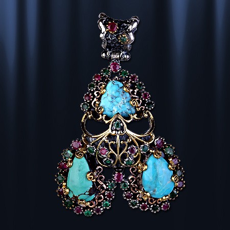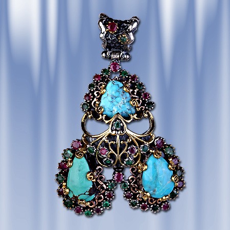бирюзы ( 12 х 12 мм., 15 х 8 мм., 14 х 10 мм), которую красиво обрамляют 22 рубина (диаметр 2 и 3 мм) и 24 изумрудов (диаметр 2 и 3 мм). Серебро чернёное 925 пробы,