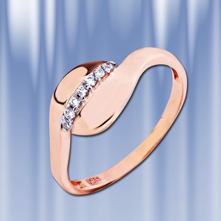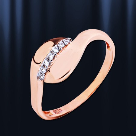 Кольцо выполнено из красного русского золота 585 пробы, украшено бесцветными цирконами Ø1 мм, являющимися идеальной имитацией бриллианта. Кольцо прекрасно подчеркнет нежность, очарование и естественность Вашей красоты.
