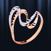 Эффектное кольцо из русского красного золота 585°, комбинированного с белым, с лазерной обработкой. Высота пр.17 мм. Изделия такого типа крайне популярны среди молодёжи и людей среднего возраста. Такие украшения хороши, в частности, тем, что одинаково удачно сочетаются и с офисными, и с повседневными, и с выходными нарядами.