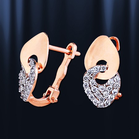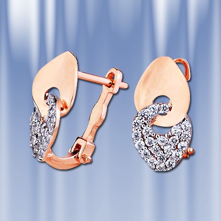 Серьги выполнены из красного русского золота 585° с бесцветными цирконами алмазной огранки, являющимися идеальной имитацией бриллианта. Эти серьги порадуют Вас своей простотой и изяществом. Серьги с английским замком - надежным и долговечным. Высота пр.12 мм.,ширина пр.8 мм.