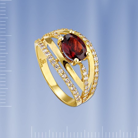 Der Ring aus russischen Gelbgold 585 mit Granat (6 x 8 mm) und farblosen Fianiten Ø1 mm. Hohe ca.13 mm