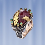 Exklusive handgemachte Ring aus geschwärztem Silber 925 mit natürliche Rubin (17 x 23 mm), 8 Smaragden Ø 2 mm dekoriert. Vergoldet