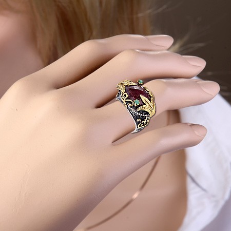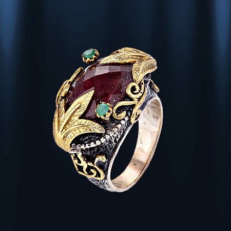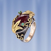 Эксклюзивное кольцо ручной работы из чернёного серебра 925 пробы украшенное рубином (14 х 17 мм), который красиво обрамляют 2 изумруда (диаметр 2 мм). Позолоченное. Кольцо, в котором чувствуется дух роскоши и элегантности, аристократизма и величия. Высота кольца пр. 18 мм.