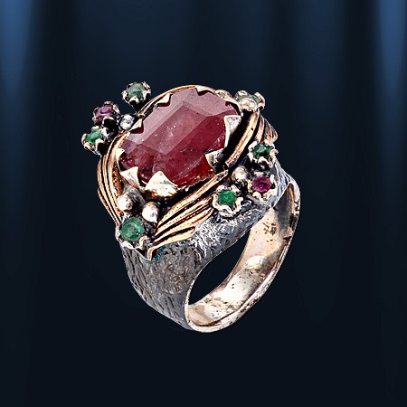 Exklusive handgemachte Ring aus geschwärztem Silber 925 mit natürliche Rubin (10 x 15 mm), 2 Rubinen Ø 2 mm und 6 Smaragden Ø 2 mm dekoriert. Vergoldet.