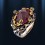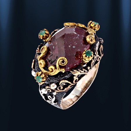 Exklusive handgemachte Ring aus geschwärztem Silber 925 mit natürliche Rubin (13 x 20 mm), 4 Smaragden Ø 2 mm dekoriert. Vergoldet.