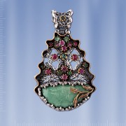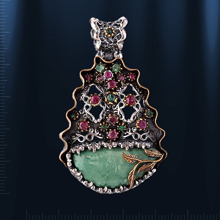 бирюзы (16 х 30 мм), которую красиво обрамляют 12 рубинов (диаметр Ø 2 и Ø 3 мм) и 8 изумрудов Ø 2 мм. Серебро чернёное 925 пробы,