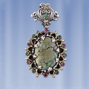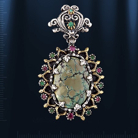 бирюзы (25 х 20 мм), которую красиво обрамляют 6 рубинов (диаметр Ø 2 и Ø 3 мм) и 8 изумрудов Ø 2 мм. Серебро чернёное 925 пробы,