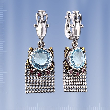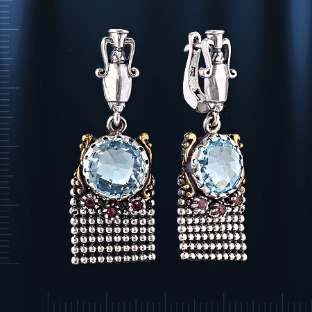 Серьги-подвески, ручной работы, выполненные из чернёного серебра 925°, позолота. Вставки: 2 топаза Ø 12 мм, 6 рубинов Ø2 мм.  Высота пр.40 мм., ширина пр. 15 мм.  Серьги с английским замком - простым, надежным и долговечным.