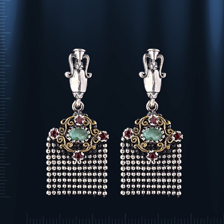 Серьги-подвески, ручной работы, выполненные из чернёного серебра 925°, позолота. Вставки: 2 топаза Ø 8 мм, 4 рубинов Ø 2 мм.  Высота пр.42 мм., ширина пр. 15 мм.  Серьги с английским замком - простым, надежным и долговечным.