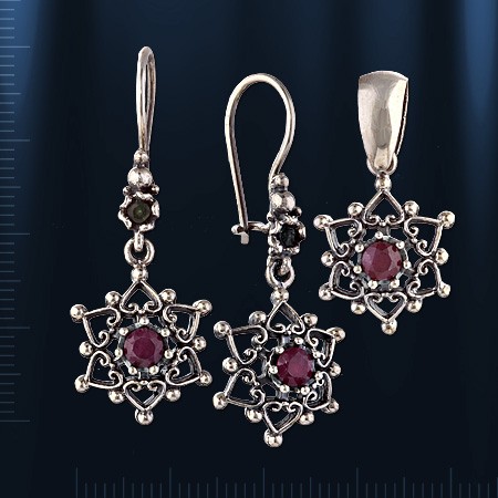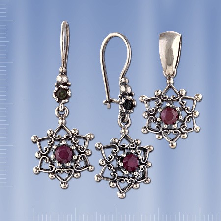 Гарнитур ручной работы из чернёного серебра 925 пробы с рубином  Ø 5 мм и изумрудом Ø 2 мм. Набор состоит из подвески и серёг с французским замком. Высота подвески пр.27 мм., ширина пр.15 мм. Высота серёг пр.40 мм., ширина 15 мм.