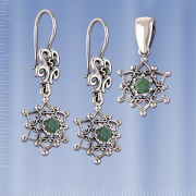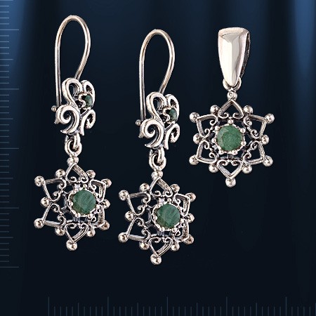 Set aus geschwärztem  Silber 925° mit  Smaragd Ø 5 mm &  Ø 2 mm. Das Set besteht aus Anhänger und Ohrringe mit Französisch Lock . Die Höhe der Anhänger ca.27 mm. Breite ca.15 mm. Höhe  Ohrringen ca.40 mm., Breite ca. 15 mm.