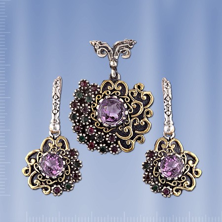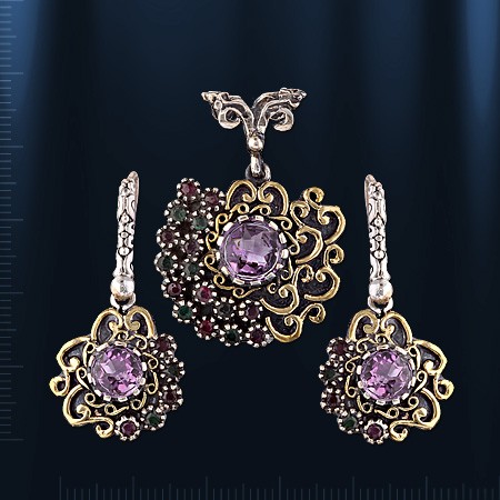 Гарнитур ручной работы из чернёного серебра 925 пробы с 3 аметистами Ø 8 мм, 15 аметистов Ø 2 мм и 11 изумрудов Ø 2 мм. Набор состоит из подвески и серёг с французским замком. Высота подвески пр.35 мм., ширина пр.25 мм. Высота серёг пр.35 мм., ширина 18 мм.