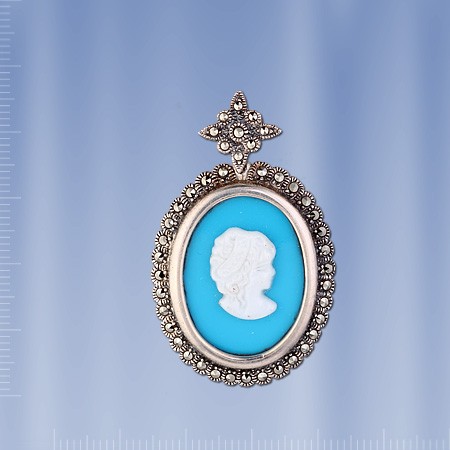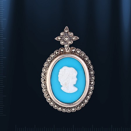 Серебряный кулон "Камея" с большой вставкой бирюзы ( 24 х 18 мм), которую обрамляет марказит. Портрет выполнен из перламутра. Серебро чернёное 925 пробы.