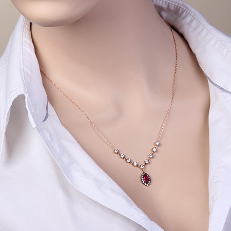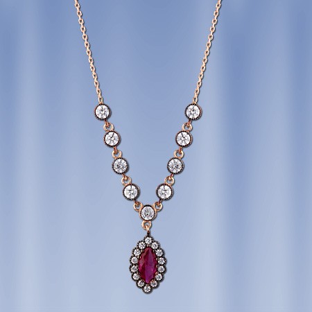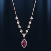 Колье из русского красного золота 585°со вставками синтетического рубина (8 х 4 мм), циркона Ø 3 мм и Ø 1 мм.