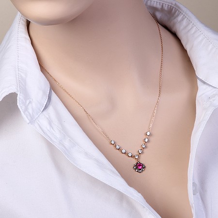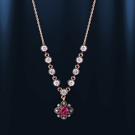 Колье из русского красного золота 585°со вставками синтетического рубина Ø 5,0 мм, циркона Ø 3,0 мм и Ø 1,0 мм.