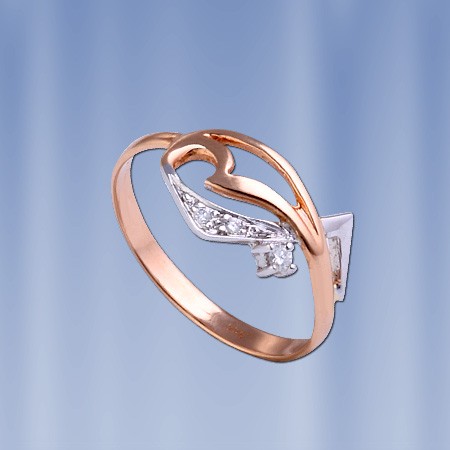 Кольцо выполнено из красного и белого русского золота 585 пробы с  бриллиантами D1:0,03 D2:0,02 карата H S1. Высота кольца пр.9 мм.