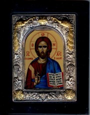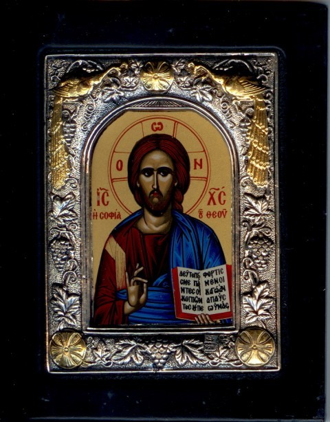 Точная копия на линолеуме старинной византийской иконы Иисуса Христа Вседержитель в окладе из серебра 925 пробы с частичной