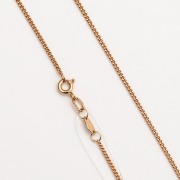 красного золота 585 с гладкими, плотно прилегающими звеньями, формирующими ровную, собранную линию. За счёт такой конструкции цепь выглядит аккуратно и уверенно, без лишней визуальной нагрузки. Полированная поверхность мягко отражает свет, подчёркивая чистоту формы и точность исполнения.