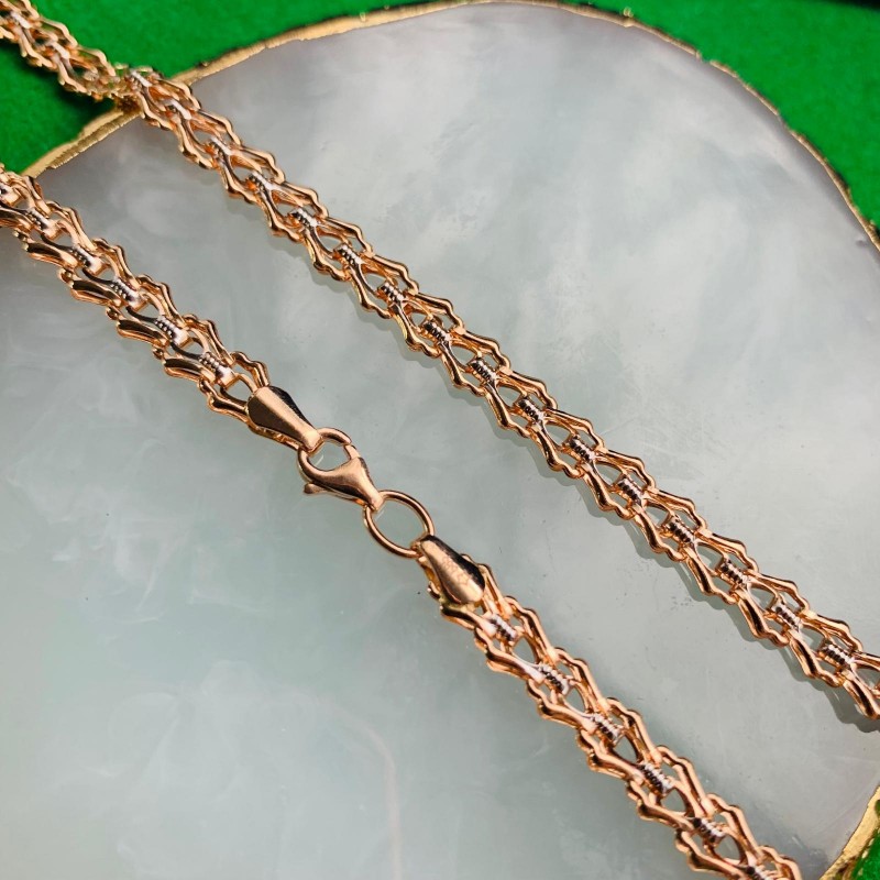 Rotgold kombiniert mit Weißgold mit funkelndem Diamantschliff. Das zweischichtige Lamellenweben ist sowohl für Frauen als auch für Männer geeignet. Ketten und Armbänder aus Gold setzen den nötigen Akzent im Bild und machen auf den Reichtum und Luxus der Accessoires aufmerksam, denn Gold ist schön, stilvoll, schick und teuer.