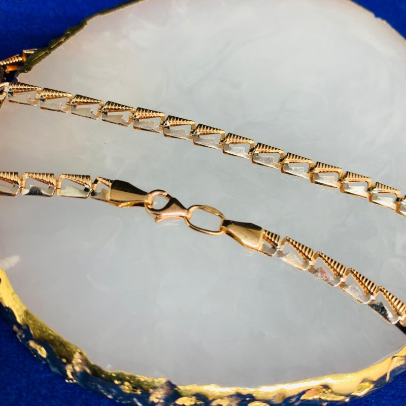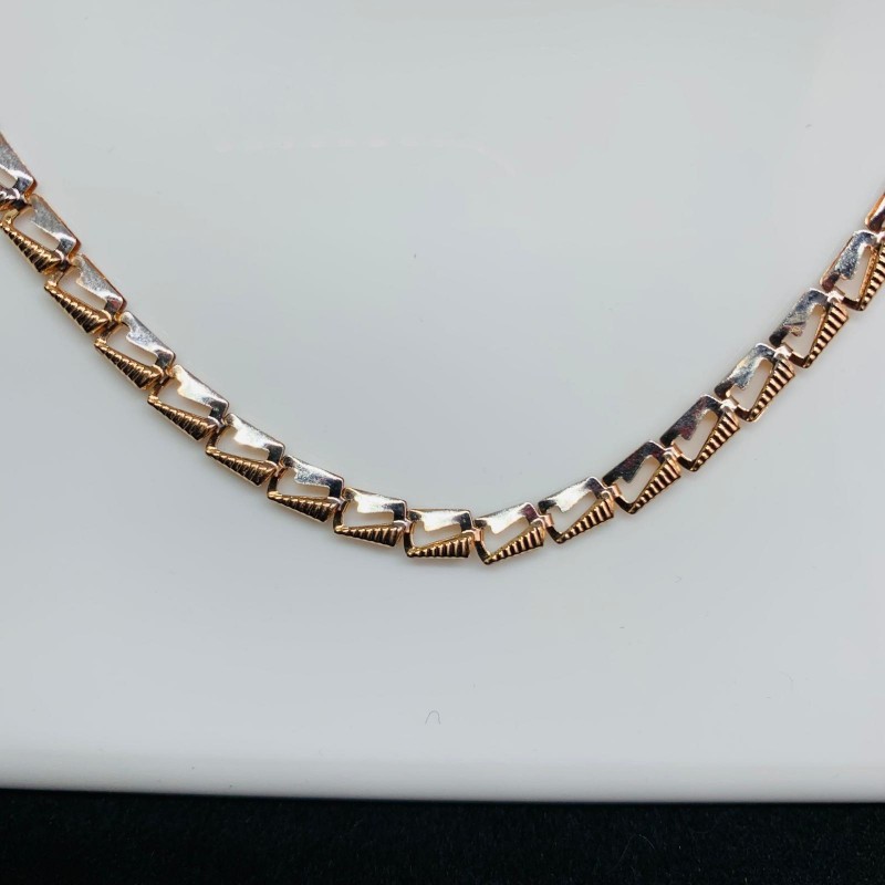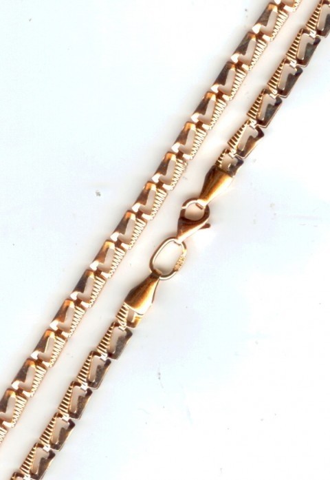 Russisches Gold 585 Goldkette in Deutschland. Flache 585er Goldkette aus 14-karätigem Rotgold kombiniert mit Weißgold mit funkelndem Diamantschliff. Das zweischichtige Lamellenweben ist sowohl für Frauen als auch für Männer geeignet. Ketten und Armbänder aus Gold setzen den nötigen Akzent im Bild und machen auf den Reichtum und Luxus der Accessoires aufmerksam, denn Gold ist schön, stilvoll, schick und teuer.