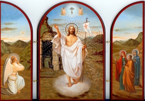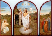 Открытый складень показывает воскресшего Христа в окружении Ангелов, и коленопрекланёных жён-мироносец, Апостолов и царей.