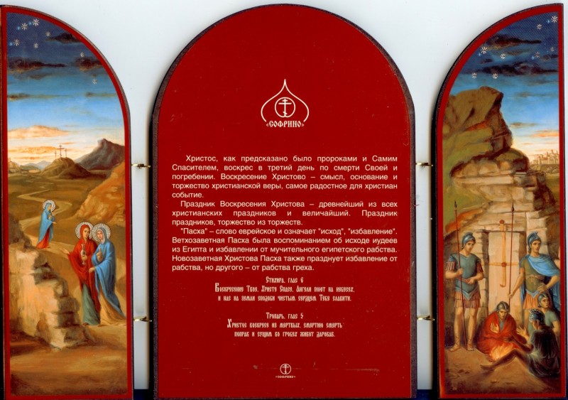 На оборотной стороне складня краткое описание Пасхи Христовой и краткие молитвы.