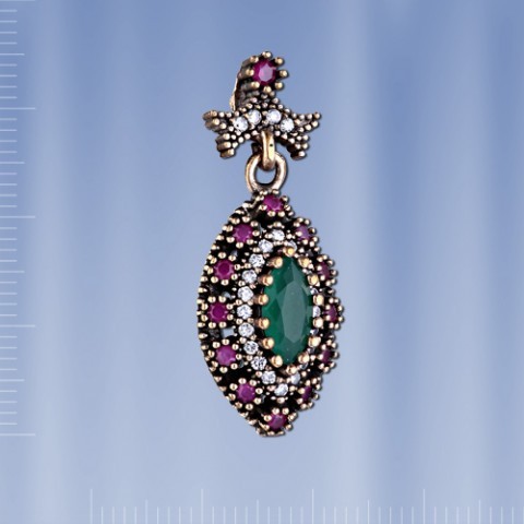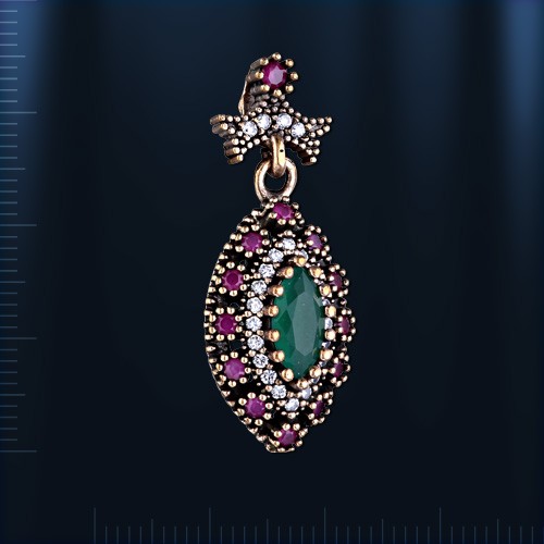 Eine stilvolle und luxuriöse Schmuck - Anhänger mit Smaragd (10 x 5 mm), Rubinen Ø 2 mm  und Fianiten Ø 1 mm. Silber 925°. Höhe mit Öse ca.35 mm, Breite ca.15 mm