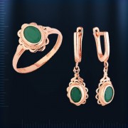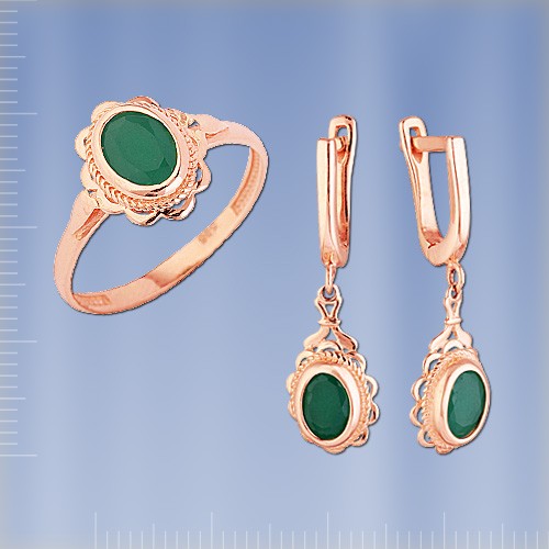 Гарнитур из русского красного золота 585 пробы с синтетическим изумрудом. Кольцо: изумруд (8 х 6  мм). Высота кольца пр.13 мм. Серьги - подвески : 2 изумруда (6 х 4  мм). Высота пр.30 мм., ширина пр.8 мм. Серьги с английским замком - простым, надежным и долговечным.