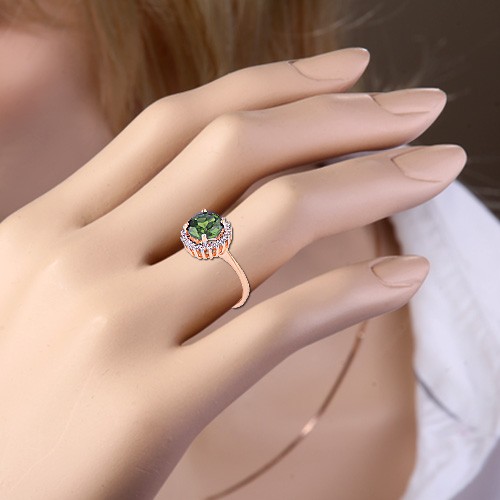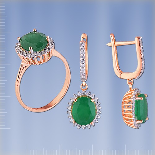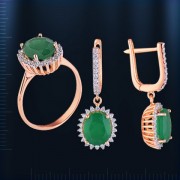 Гарнитур из русского красного золота 585 пробы с синтетическим изумрудом и фианитами. Кольцо: изумруд (10 х 8  мм), 22 фианита ¢ 1 мм. Высота кольца пр.13 мм. Серьги - подвески : 2 изумруда (10 х 8  мм), 64 фианита ¢ 1 мм. Высота пр.31 мм., ширина пр.12 мм. Серьги с английским замком - простым, надежным и долговечным.