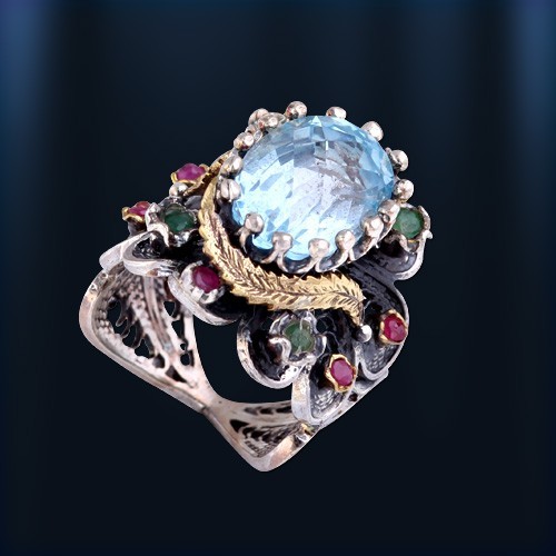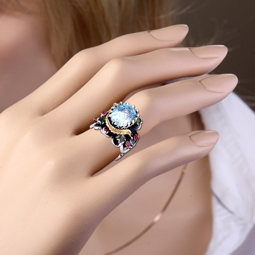 Эксклюзивное кольцо ручной работы из чернёного серебра 925 пробы украшенное крупным топазом (15 х 10 мм), который красиво обрамляют 6 рубинов ¢ 2 мм и 4 изумруда ¢ 3 мм. Кольцо, в котором чувствуется дух роскоши и элегантности, аристократизма и величия. Высота кольца пр.22 мм.