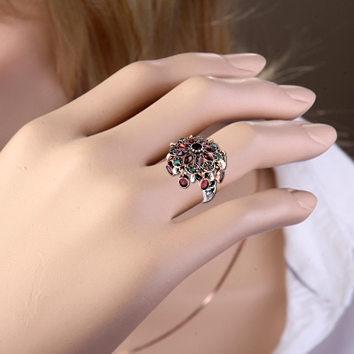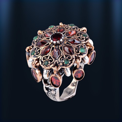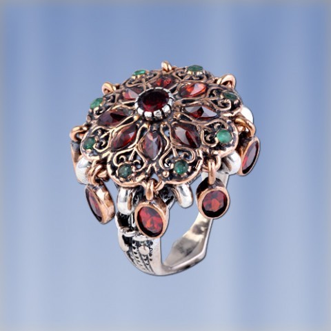 Эксклюзивное кольцо ручной работы из чернёного серебра 925 пробы со вставками граната ¢ 3 мм, 8 -и гранатами (5 х 2 мм), 8 изумрудов ¢ 1,5 мм. По всей окружности кольцо украшают 8 подвесок из граната (5 х 3 мм) обрамлённые бронзой. Кольцо, в котором чувствуется дух роскоши и элегантности, аристократизма и величия. Диаметр кольца пр.22 мм.
