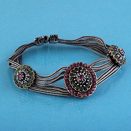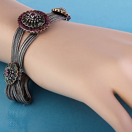 Eine stilvolle und luxuriöse Schmuck - Armband mit  Rubinen,  Smaragden. Silber 925°. Durchmesser: 18 cm, Breite 20 mm