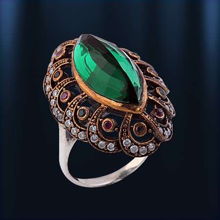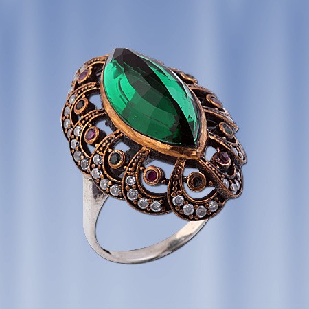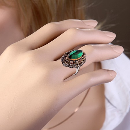 Эксклюзивное кольцо ручной работы из чернёного серебра 925 пробы украшенное синтетическим изумрудом (20 х 10 мм), 6 -  ю изумрудами ¢ 1 мм,  6 -  ю рубинами  ¢ 1 мм и цирконами  ¢ 1 мм. Бронза. Кольцо, в котором чувствуется дух роскоши и элегантности, аристократизма и величия. Высота  кольца пр.30 мм.