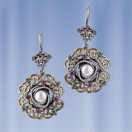 Серьги - подвески, ручной работы, выполненные из чернёного серебра 925°. Вставки: 2 жемчужины  ¢ 8 мм, 12 изумрудов ¢ 2 мм, 10 рубинов ¢ 2 мм., бронза. Высота пр.57 мм., ширина пр. 33 мм. Серьги с французским замком - простым, надежным и долговечным.