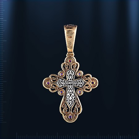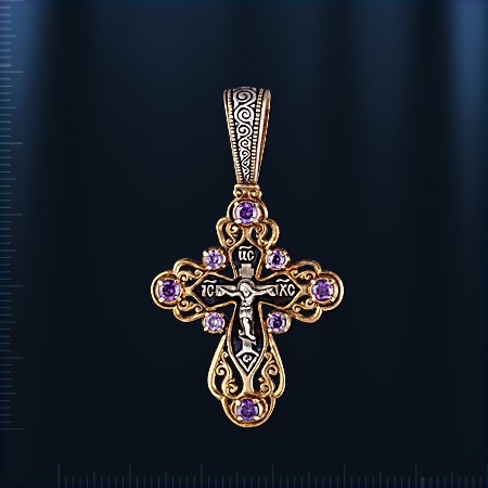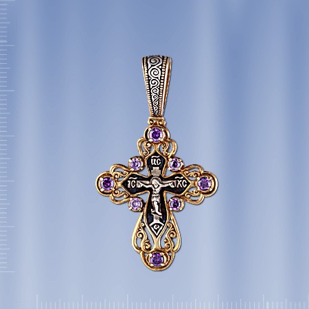 Православный крест из чернённого серебра 925 пробы позолоченный 999 пробы с фианитами ¢ 3 мм., ¢ 4 мм. Высота с ушком пр.48 мм., ширина пр.27 мм.