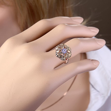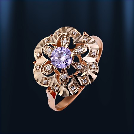 красного золота шириной 2,3 мм и тощиной 0,8 мм закреплена верхняя декоративная часть кольца, состоящая из двух узорчатых полусфер диаметром 17,0 мм, напоменающих резной узор снежинок: нижняя полусфера выполнена из