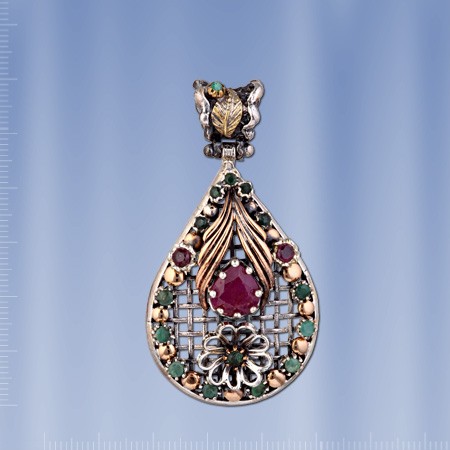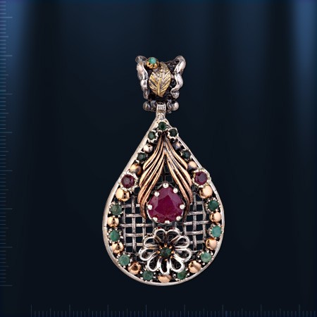 Eine stilvolle und luxuriöse Schmuck - Anhänger aus geschwärztem Silber 925 ° mit einem großen Insertion von Rubin (10 x 8 mm), die wunderschön von 8 Smaragden ¢ 3 mm, 6 Smaragden ¢ 2 mm und  2 Rubinen ¢ 3 mm sind eingerahmt. . Höhe 58 mm, Breite 32 mm