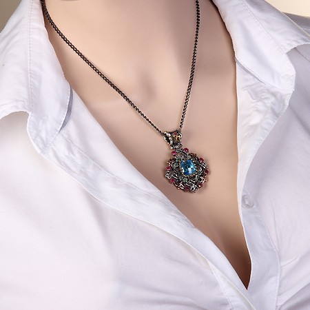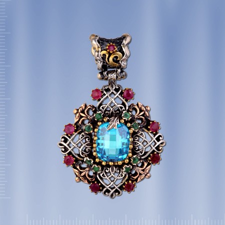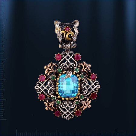 Стильное и роскошное украшение ручной работы - кулон со вставкой аквамарина ( 11 х 13 мм), которую красиво обрамляют  9 рубинов ¢ 3 мм., 8 изумрудов ¢ 3 мм и 8 изумрудов ¢ 2 мм. Серебро чернёное 925 пробы, бронза.  Высота пр. 50 мм., ширина пр. 33 мм.