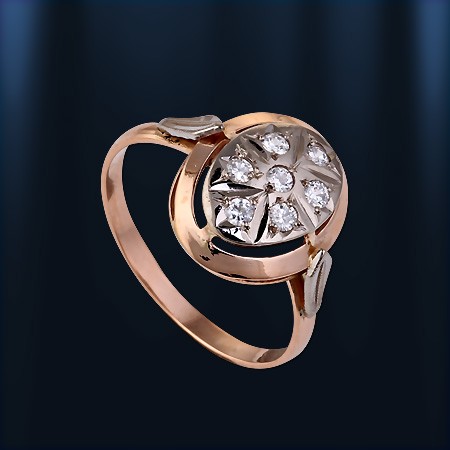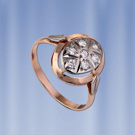 Кольцо выполнено из красного русского золота 585 пробы, комбинированного с белым и украшено  цирконами Ø 2 мм, являющимся идеальной имитацией бриллианта. Кольцо прекрасно подчеркнет нежность, очарование и естественность Вашей красоты. Ширина пр. 15 мм.