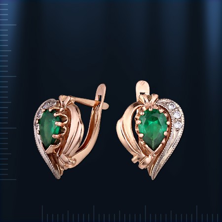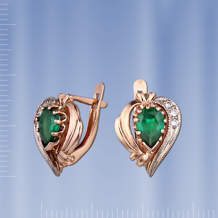 Goldohrring aus Rot-Weißgold 585° verziert mit  2 Smaragden ( 8 x 5 mm) und Zirkonia ¢ 2 mm. Hohe ca.15 mm., Breite ca. 12 mm.