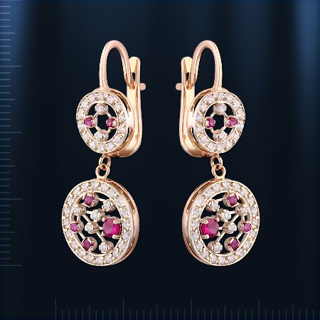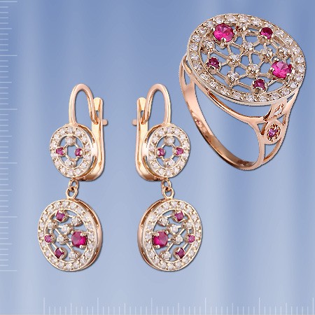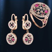 Гарнитур из русского красного золота 585 пробы с рубинами и фианитами. Кольцо: 2 рубина ¢ 3 мм, 3 рубина ¢ 2 мм,  фианиты ¢ 1 мм. Высота кольца пр.17 мм. Серьги - подвески : 2 рубина ¢ 3 мм, 4 рубина ¢ 2 мм., 6 рубинов ¢ 1 мм., фианиты ¢ 1 мм. Высота пр.34 мм., ширина пр.14 мм. Серьги с английским замком - простым, надежным и долговечным.