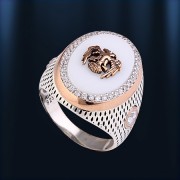Мужское кольцо из серебра 925 пробы с золотистыми вставками из благородной брозны. Кольцо украшено крупной вставкой белого оникса (18 х 13 мм), цирконы ¢ 1 мм. На боковых частях кольца вставки цирконов ¢ 5 мм. Классическое мужское кольцо, которое придаст элегантность любому мужчине. Высота кольца пр.24 мм.
