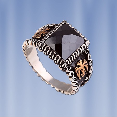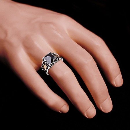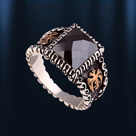Мужское кольцо из серебра 925 пробы с золотистыми вставками из благородной брозны. Кольцо украшено гранатом (10 х 12 мм). Внутренняя часть кольца украшенна орнаментом. Классическое мужское кольцо, которое придаст элегантность любому мужчине. Высота кольца пр.15 мм.