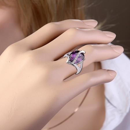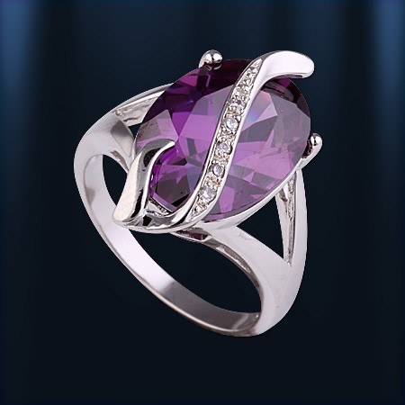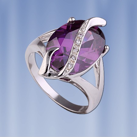 Кольцо выполнено из серебра 585 пробы украшено аметистом (12 х 16 мм) и сверкающими цирконами ¢ 1 мм. Кольцо прекрасно подчеркнет нежность, очарование и естественность Вашей красоты. Высота кольца пр.23 мм.