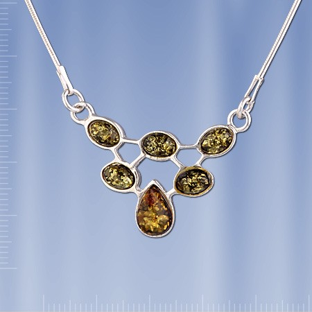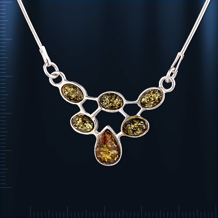 Колье из серебра 925° с теплыми вставками зелёного янтаря. Длина 45 см.