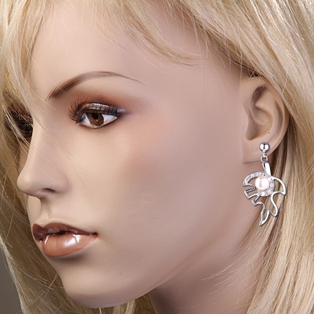Серьги - подвески с жемчугом ¢ 6 мм и циркона ¢ 1 мм. Высота пр. 36 мм, ширина пр.20 мм. Серьги креплением "пуссеты" - простым, надежным и долговечным.