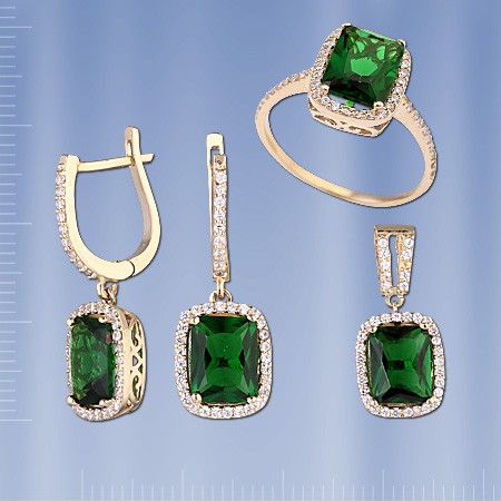 Гарнитур из жёлтого золота 585 пробы со вставками синтетического изумруда и фианитами.